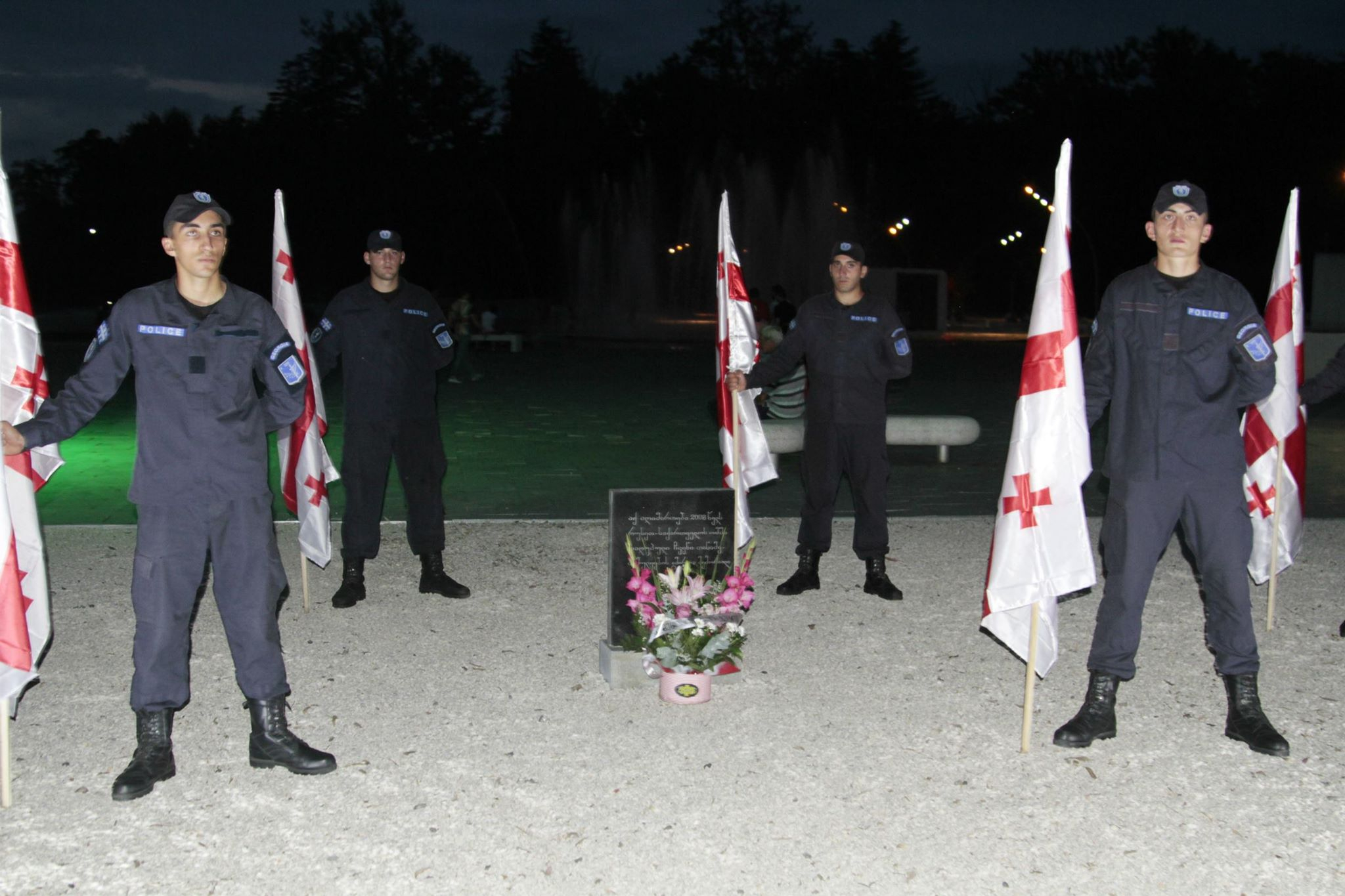წარმომადგენლებმა ჯარისკაცებთან ერთად, სიმბოლური ნიშნული ყვავილებით