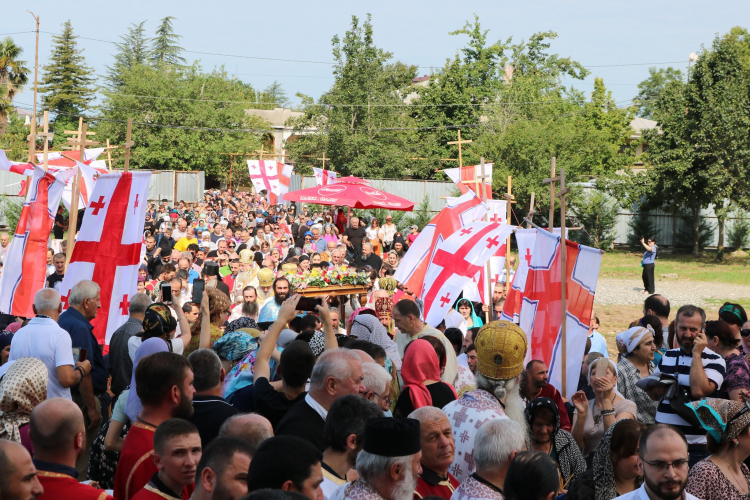 სასულიერი პირებმა ზუგდიდისა და ცაიშის მიტროპოლიტ მეუფე გერასიმესთან ერთად კვართი და წმინდანთა ნაწილები გამოაბრძანეს და მსვლელობითა და გალობით მშენებარე საკათედრო ტაძრისკენ გაიმართნენ.