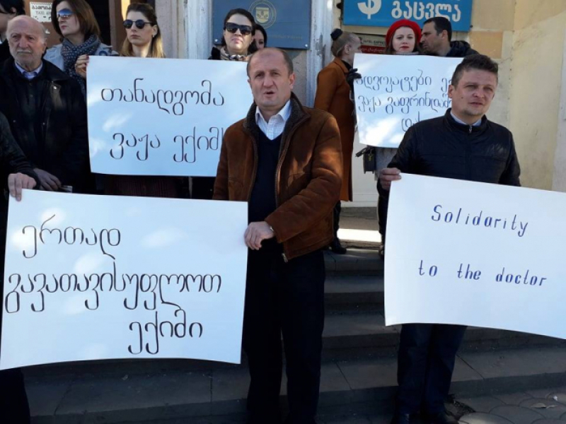 მათ ხელში ეჭირათ პლაკატები შემდეგი წარწერებით: „თანადგომა ვაჟა ექიმს“, „ერთად გავათავისუფლოთ ექიმი“, "ადვოკატები ვაჟა ექიმის დასაცავად" და სხვ.