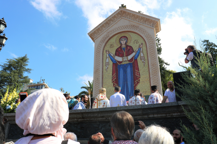 ცენტრალურ მოედანზე ღვთისმშობლის მოზაიკური ფრესკა ზუგდიდისა და ცაიშის მიტროპოლიტმა სხვა სასულიერო პირებთან ერთად გახსნა.