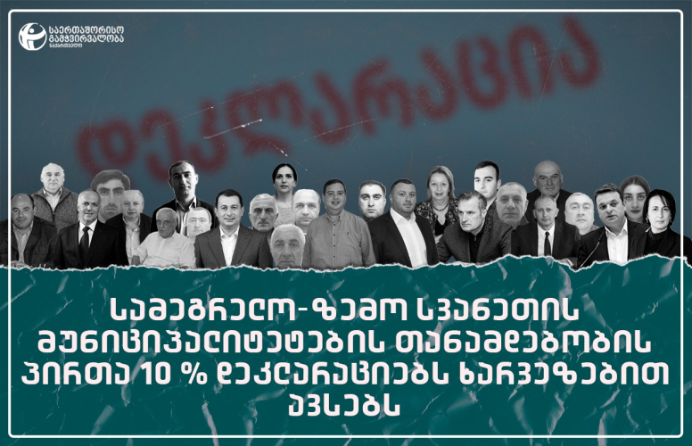 "საერთაშორისო გამჭვირვალობა - საქართველოს" მიერ შესწავლილი დოკუმენტაციით, სამეგრელო-ზემო სვანეთში 250-ზე მეტი თანამდებობის პირის დეკლარაციიდან, 26 ხარვეზიანი აღმოჩნდა.