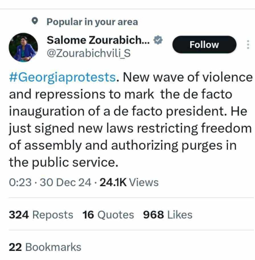 „მან ახლახან მოაწერა ხელი ახალ კანონებს, რომლებიც ზღუდავს შეკრების თავისუფლებას და [„ქართულ ოცნებას"] საჯარო სამსახურებში „წმენდის“ უფლებას აძლევს“, - წერს სალომე ზურაბიშვილი პლატფორმა X-ზე.