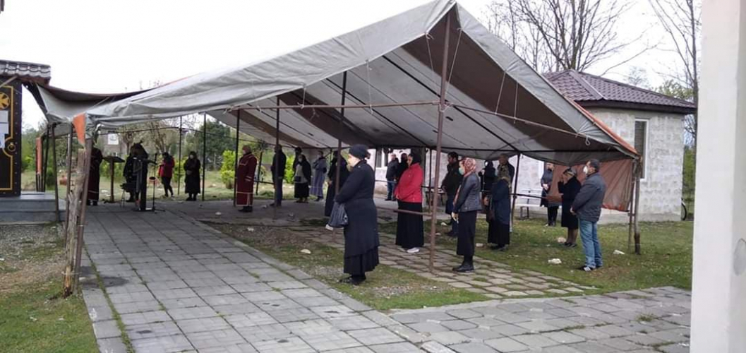 სახელდახელოდ აგებულ ფანჩატურში იმყოფებოდნენ. ტაძრის წინამძღვარმა, მღვდელმა კონსტანტინე ხვიჩიამ წირვა-ლოცვა ეკლესიის შესასვლელთან აღასრულა. სასულიერო პირის თქმით, მათ ამით მედიკოსების რეკომენდაციები დაიცვეს და მომავალშიც ასე აპირებენ გაგრძელებას. მისივე ინფორმაციით, ეკლესიის გარეთ ჰქონდათ გატანილი, როგორც ხატები, ასევე სასანთლეები.